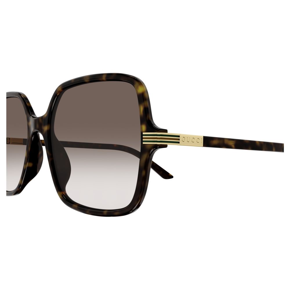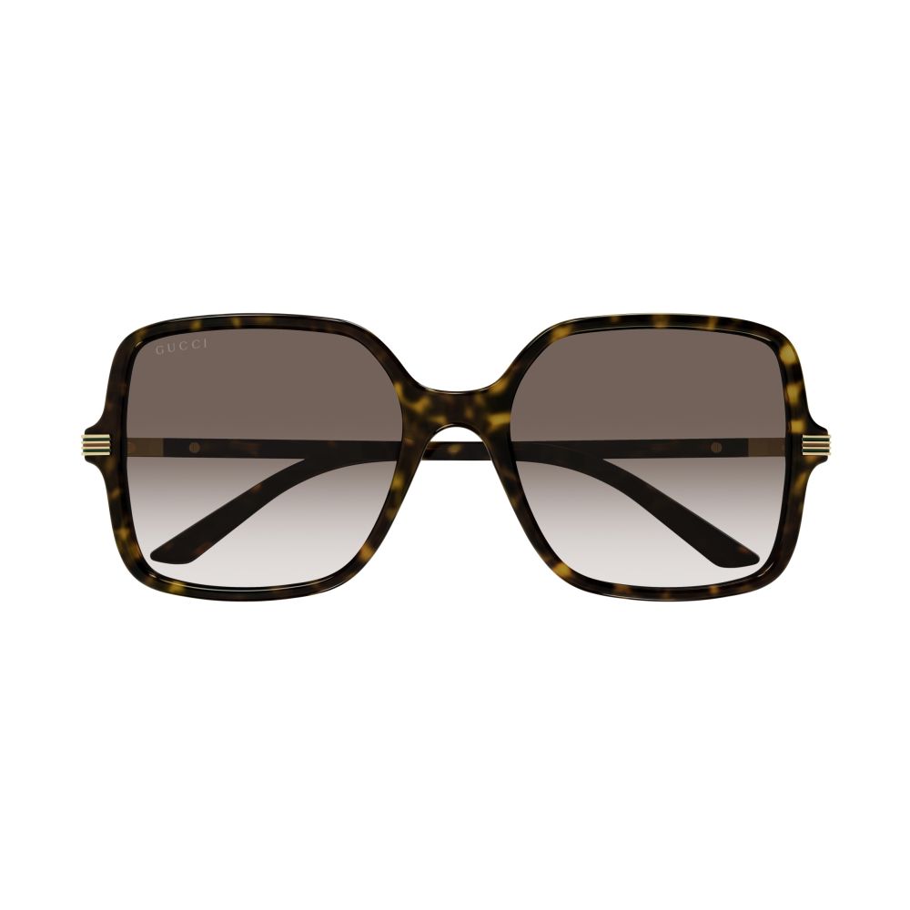 Gucci GG1449S-002 55 Damen Sonnenbrille RECYCLED Acetat in Havanna braun. Dieses Konzept ist von dem Look und dem Lebensgefühl der 70er inspiriert und bildet das Web in einem emaillierten Detail aus Metall auf dem Scharnier nach. Die eckige Oversize-Form ist aus leichtem Acetat gefertigt. Auf dem Bügel ist das Gucci Schriftzuglogo als Lasergravur auf einer Metallplakette angebracht. Die Farbpalette kombiniert klassische und feminine Farben wie Burgunderrot.