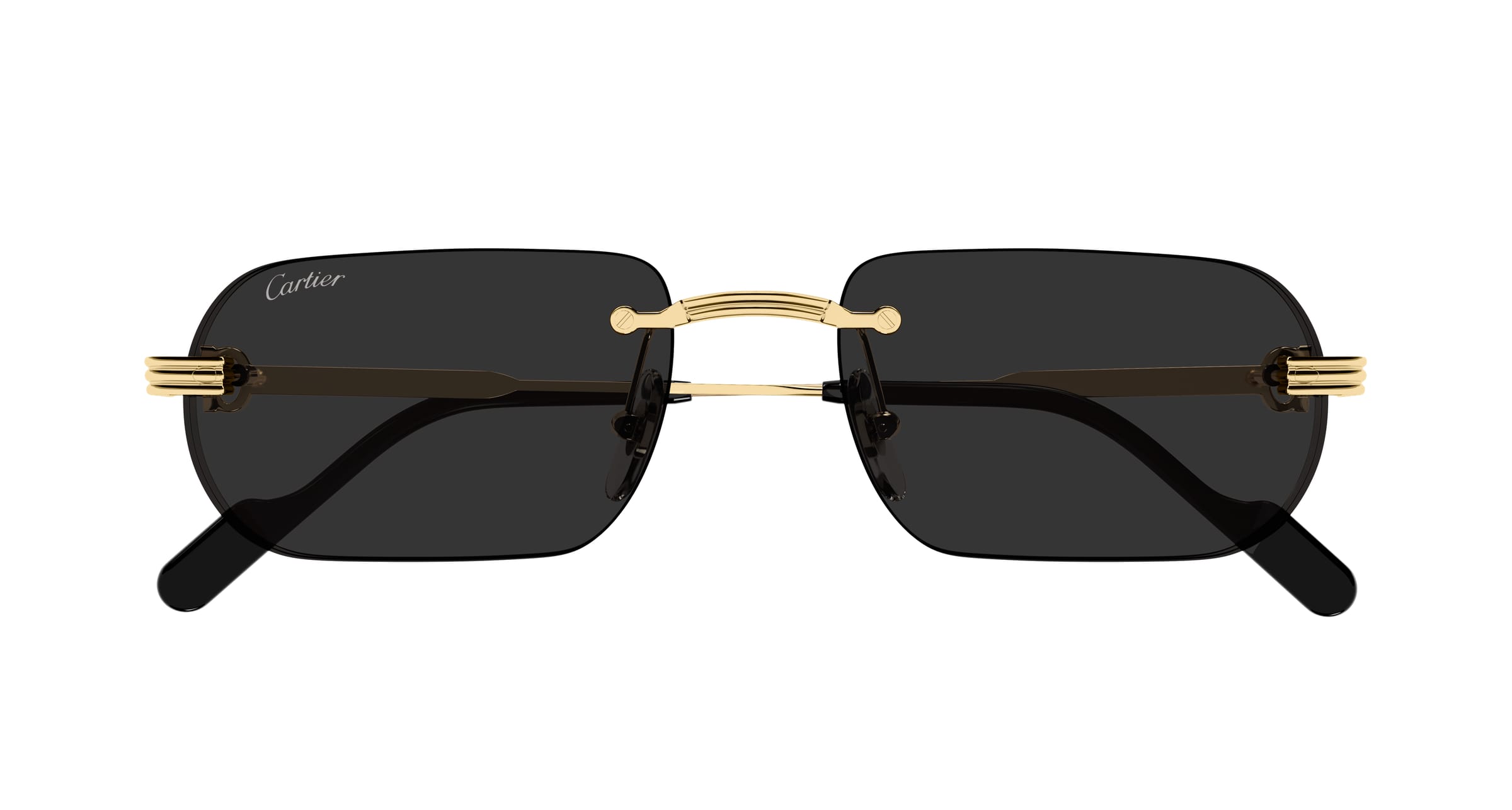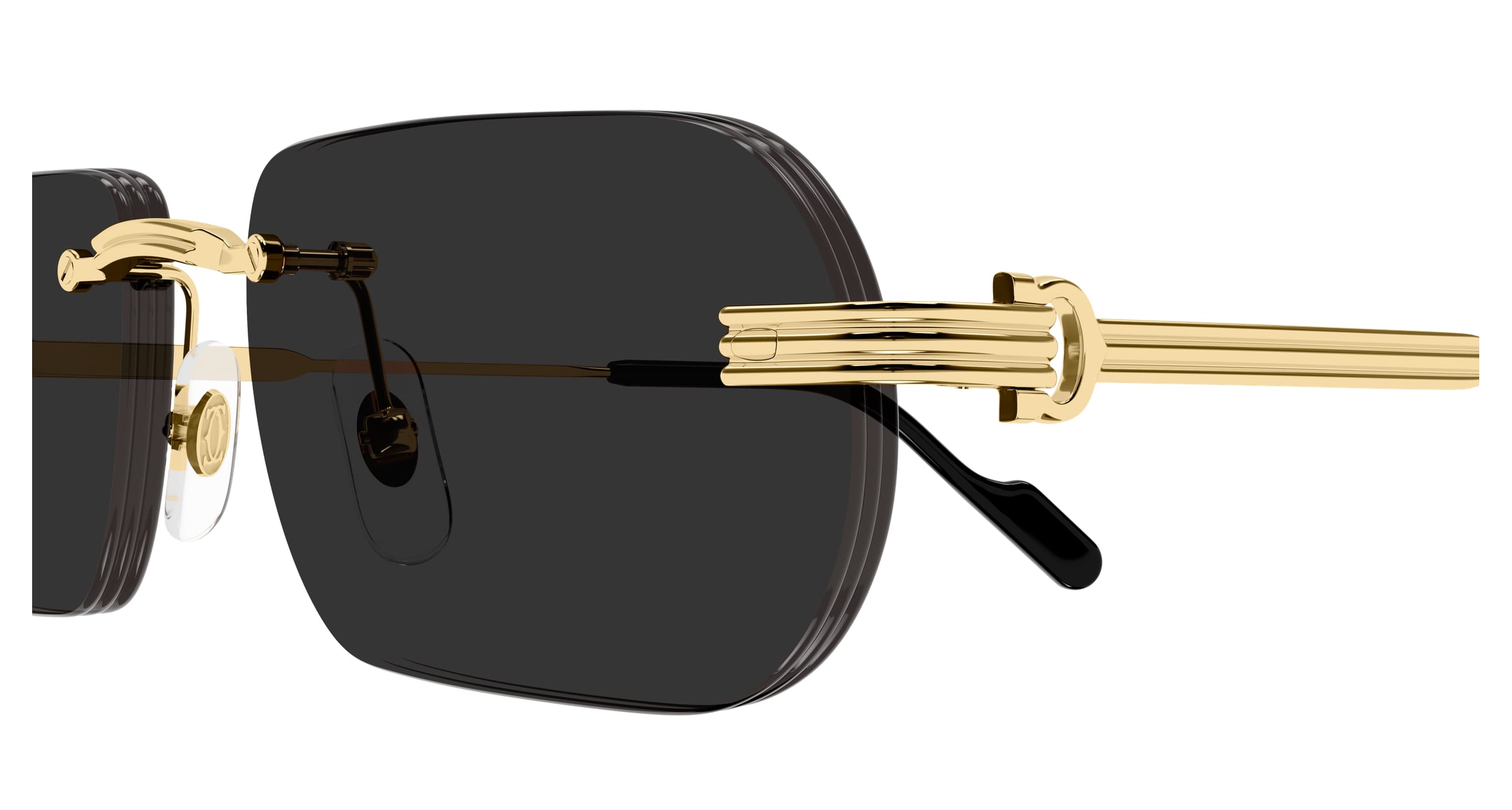 Elegante, alltagstaugliche und dezent rechteckige Form in randloser Bauweise, das die bestehende kühne Ästhetik von Première ergänzt. Dicke Gläser, die durch das ultra-ikonische Godron-Detail entlang der Konturen bereichert sind und einen authentischen Look bieten. Die ikonischen Bügel sind mit dem Signature C und dem Godron-Detail versehen, die beide als ästhetisches und funktionales Element des Scharniers dienen. Cartier Logo-Schildchen auf den Bügelenden aus Acetat, inspiriert durch Vintage-Modelle, und edles Gold- oder Platin-Finish.