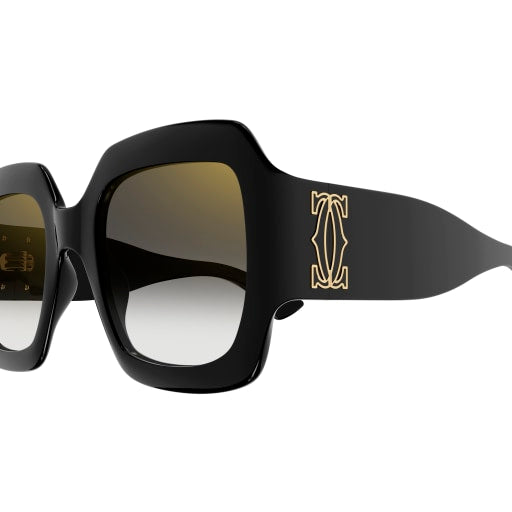 Die Double C Kollektion aus Acetat wird um eine klassische, eckige Oversize-Form erweitert. Das Gestell aus hochverdichtetem Acetat sorgt für ein markantes Design und garantiert gleichzeitig die Leichtigkeit des Rahmens. Das ikonische Double C Detail ist mit Emaille im gleichen Farbton wie die Gläser versehen. Die neuen Emaille- und Acetatfarben sind von der Lederwarenkollektion von Cartier inspiriert. Cartier CT0434S-001 54 Sonnenbrille Damen Acetat schwarz.