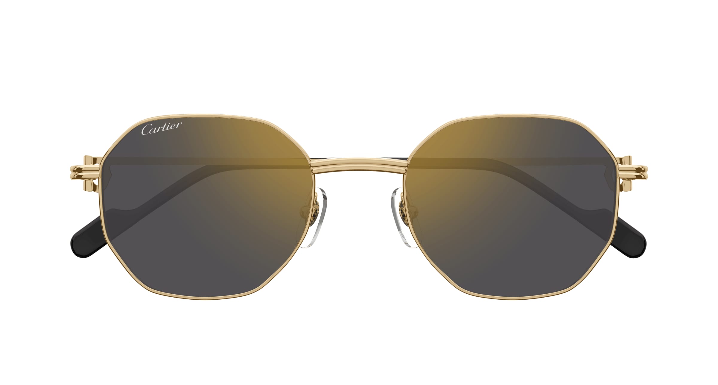 Neue, leichtere Version des Metallrahmens Première de Cartier, die sich durch die edlen und feiner gehaltenen Godron- und C de Cartier-Details auf dem Scharnier auszeichnet. So entsteht ein alltagstauglicher und doch unverkennbarer Look. Zeitgemäße und polygonale Unisex-Form mit Vollrand sowie leichten Metallbügeln. Einfarbige Zeissgläser in verschiedenen Farben runden das Modell ab und verleihen ihm einen jugendlichen und doch edlen Look. Ein edles Gold-Finish, die Cartier-Logoplakette auf den Bügelenden aus Acetat und der Double C Décor auf den Nasenauflagen runden das Modell ab.