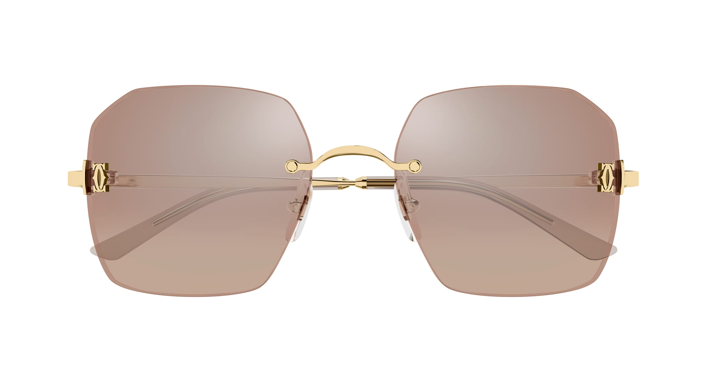 Leichte und moderne Double C Interpretation aus Metall mit dem ikonischen Logo-Detail auf der Front. Feminine, eckige Oversize-Form in randloser Bauweise für einen edlen Look. Leichte, farbige Gläser, die perfekt zum Rahmen passen und für einen frischen Look sorgen. Kostbares Gold-Finish, kombiniert mit transparenten Bügelenden aus Acetat, die Tragekomfort garantieren.