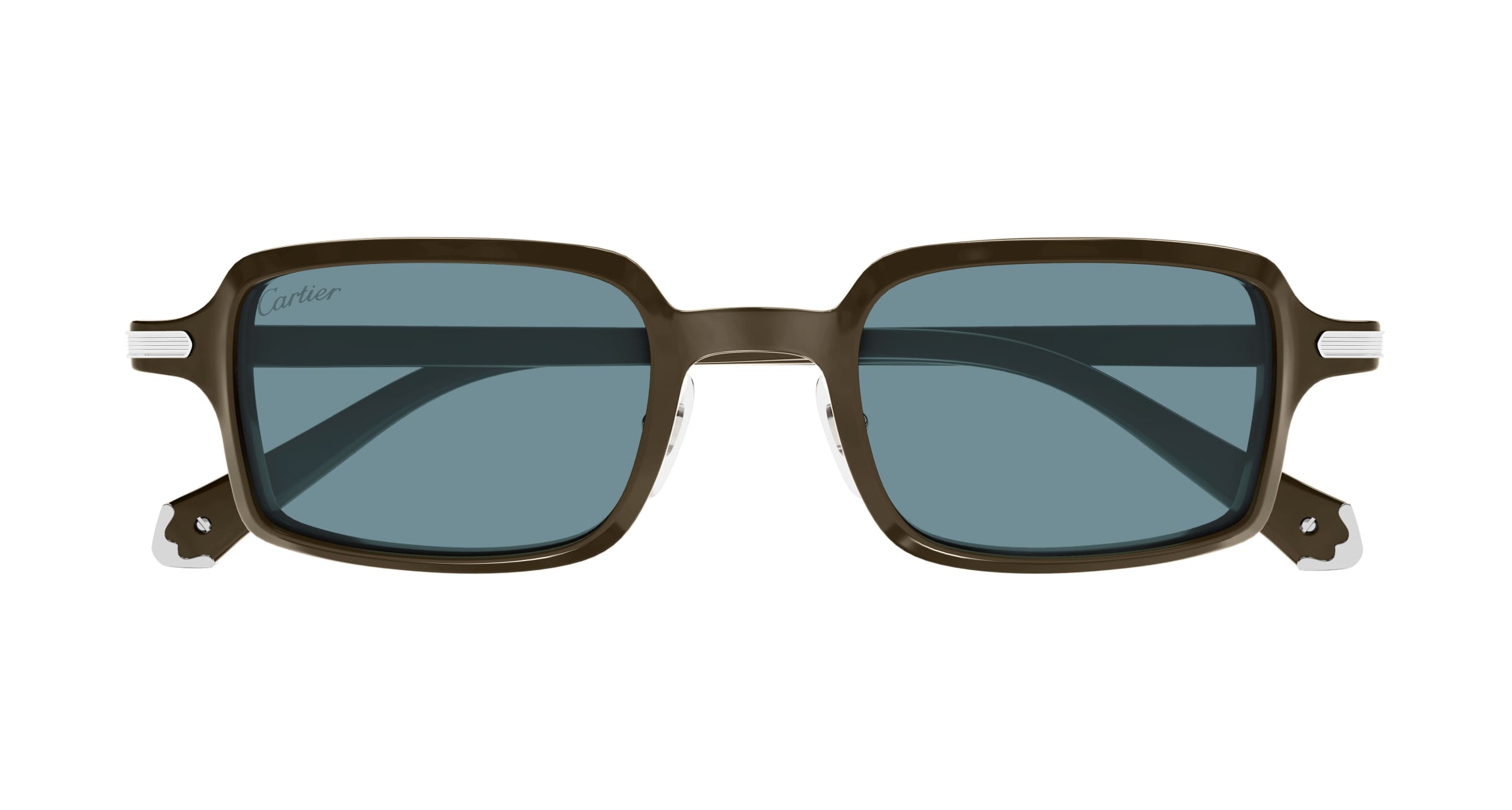 remière de Cartier Sonnenbrille aus braunem Azetat, Detail aus Metall in glattem Platin-Finish auf den Bügeln, rechteckige Form, hellblaue Gläser.