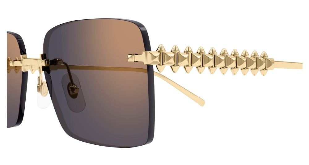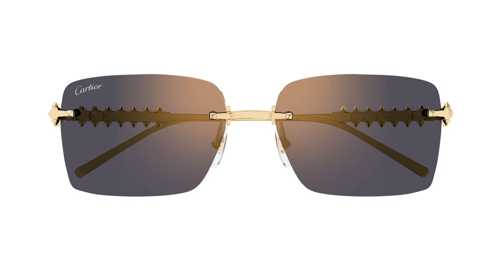 Clash de Cartier Sonnenbrille aus Metall, nicht eingefasst, glattes Gold-Finish, eckige Form, Gläser mit pinkem Verlauf und goldenem Spiegeleffekt. Maße: Gläser 58 mm, Steg 17 mm, Bügel 140 mm.