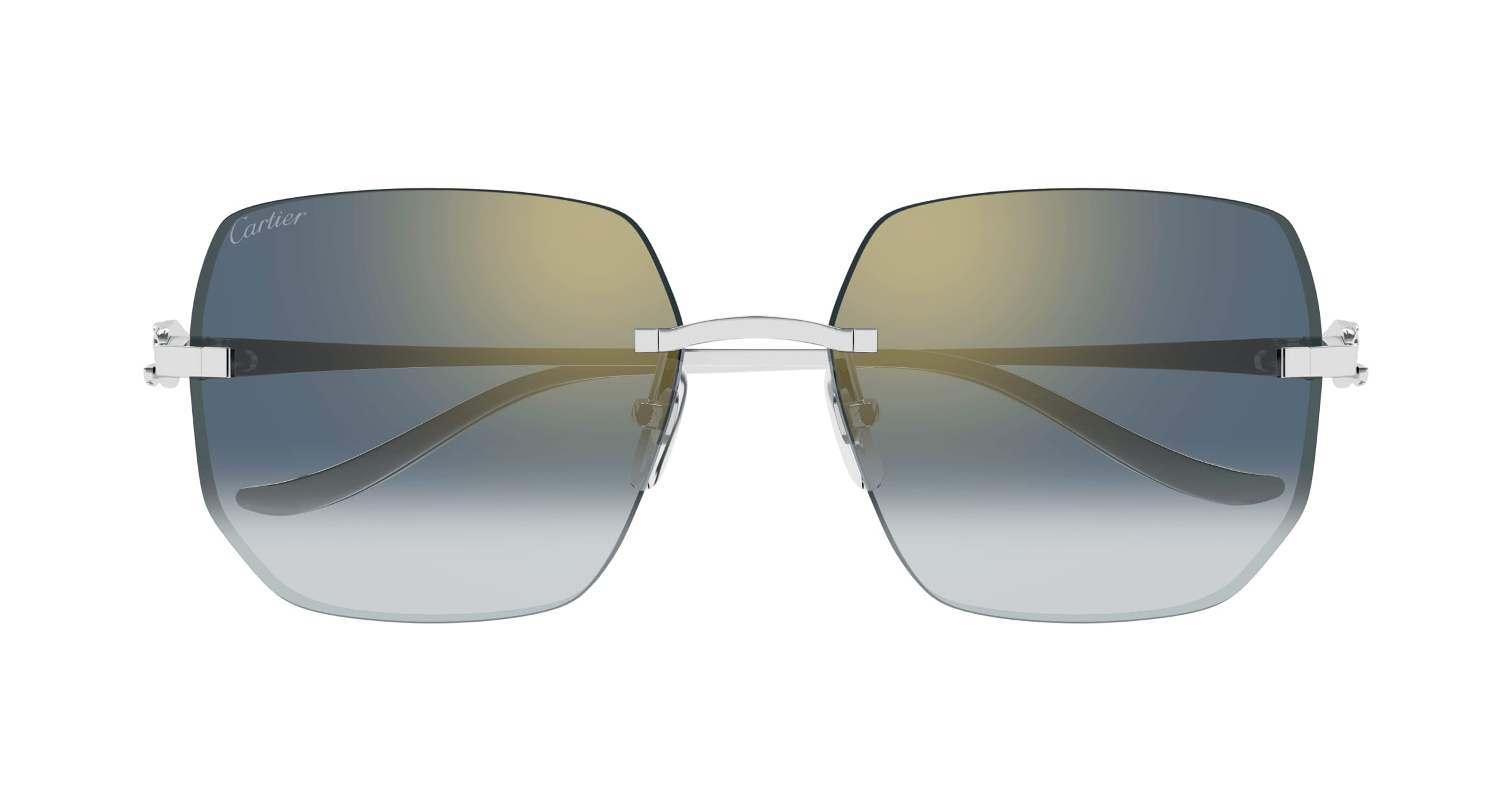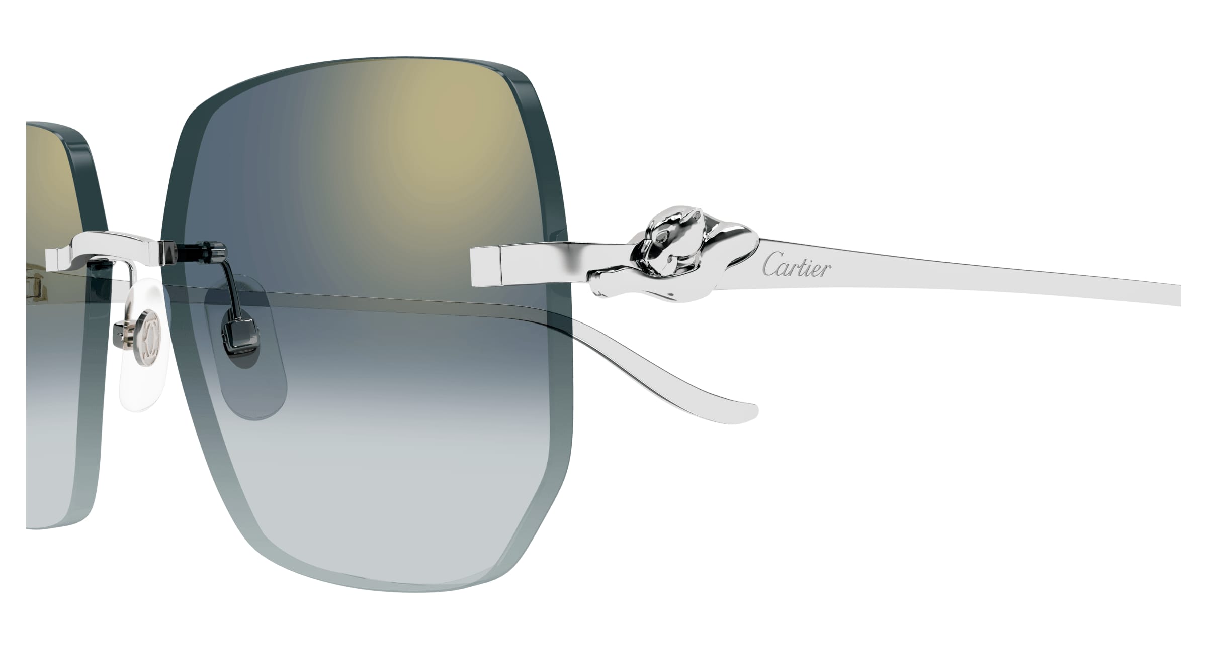 Neu aufgepepptes, zweidimensionales Panthère-Vollmetall-Modell, bei dem der Körper des Panthers über den gesamten Bügel verläuft. Elegante eckige Oversize-Form mit randloser Konstruktion. Die ikonische, detailreiche Panthère-Silhouette verziert das Scharnier. Ein edles Gold- oder Platin-Finish zusammen mit farbigen Gläsern und Double C-Logo auf den Nasenauflagen runden das Modell ab.