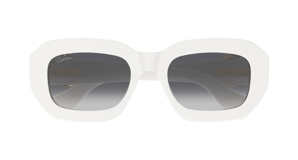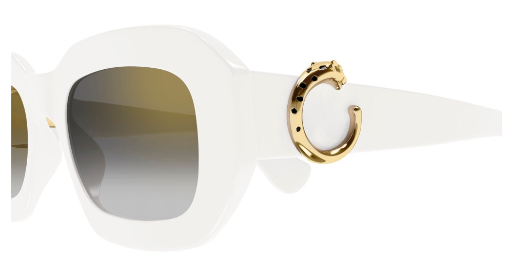 Panthère de Cartier Sonnenbrille aus weißem Azetat, Detail aus Metall in glattem Gold-Finish auf den Bügeln, rechteckige Form, grau verlaufende Gläser mit goldenem Spiegeleffekt. Maße: Gläser 51 mm, Steg 21 mm, Bügel 140 mm.