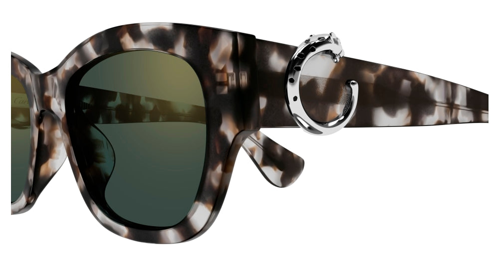 Neue, leichtere Version der Panthère C Ästhetik, gekennzeichnet durch dünnere Acetat-Konturen und harmonische Proportionen, um Tragekomfort zu garantieren und die Tragbarkeit zu verbessern. Feminine, dezente Cat-Eye-Form, perfekt für einen eleganten und edlen Look. Das ikonische dreidimensionale Panthère C Detail ist mit handgefertigten Emaille-Flecken verziert und setzt einen Schmuckakzent auf den Bügeln. Kostbares Finish in Gold und Platin kombiniert mit neuen Havanna-Tönen bei einigen Modellen.