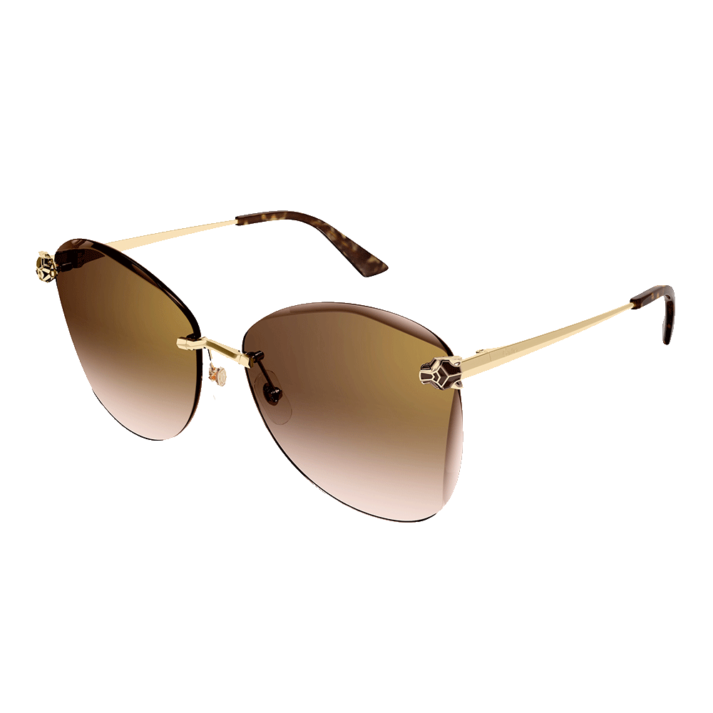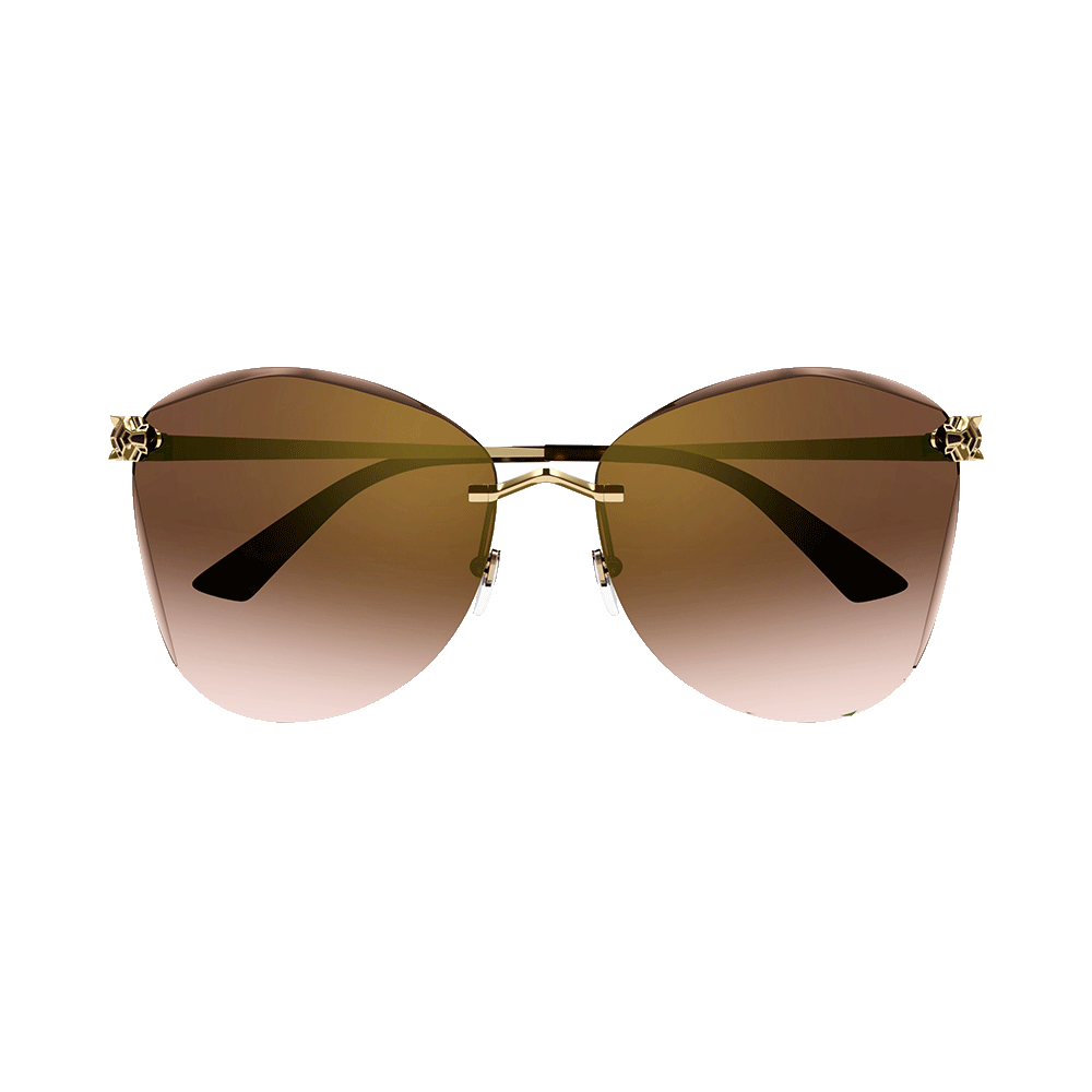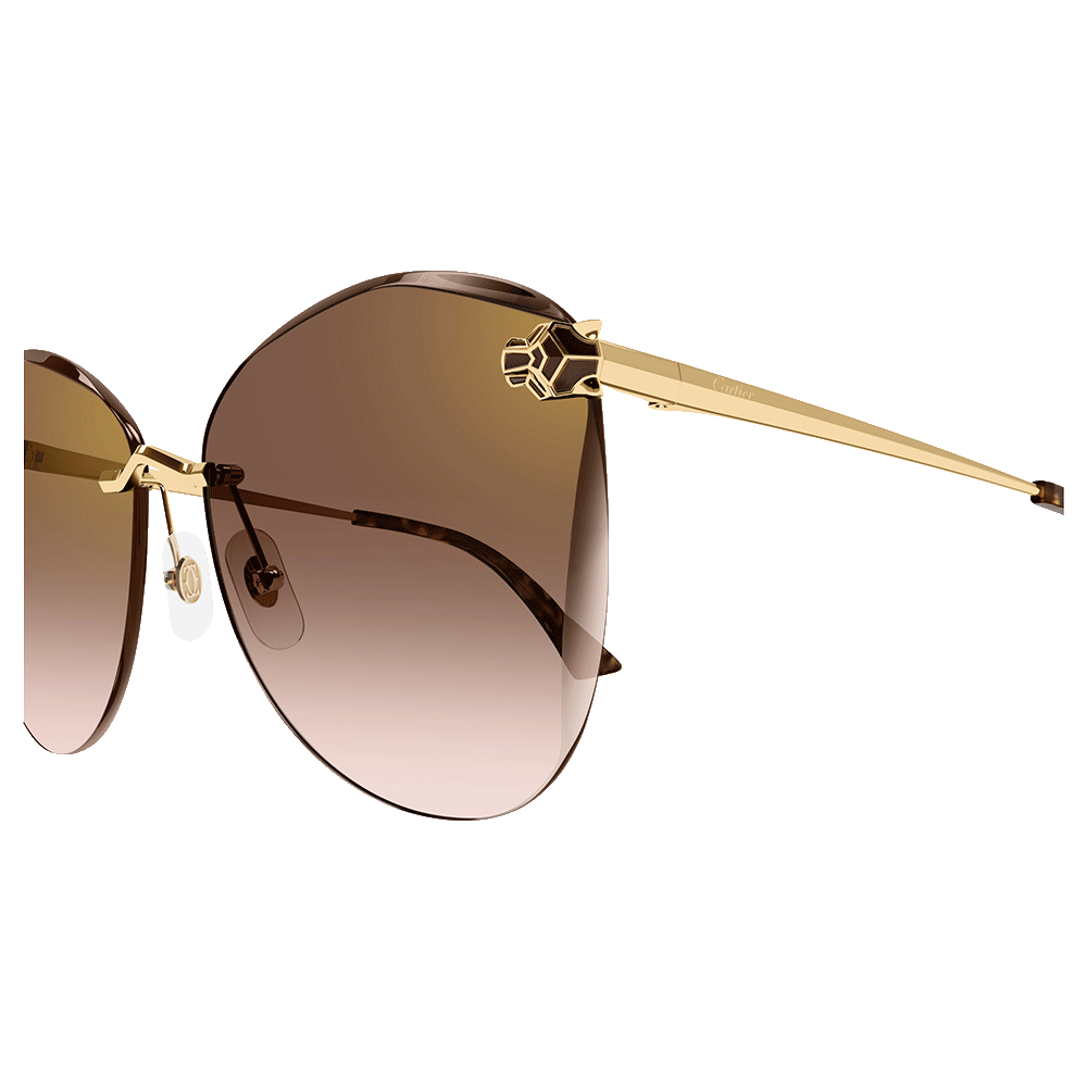 Die neue Panthère-Ästhetik zeichnet sich durch einen innovativen, dreidimensionalen Panthère-Kopf mit geometrischen Facetten und Emaille-Details aus. Die elegante, randlose dezente Cat-Eye-Form erhält durch den abgeschrägten Effekt an den Gläsern und den Panthère-Kopf, der in das Glas beißt, ein markantes und besonders feminines Flair. Ein kostbares Gold-Finish rundet das Modell ab, während Bügelenden aus Acetat für hohen Tragekomfort sorgen.
