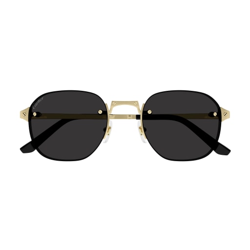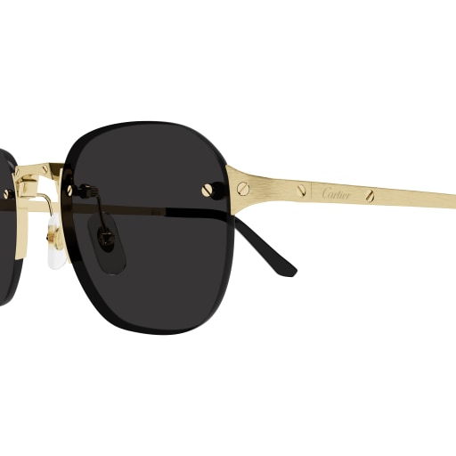 Cartier CT0459S-001 51 Sonnenbrille Herren Metall randlos. Die moderne Pantoform ergänzt die Santos Classic Produktfamilie mit einem neuen, randlosen Gestell, das ebenso leicht wie modern ist. Die Gläser und die unverkennbaren Santos Bügel sind mit den ikonischen Santos Schrauben versehen. Die Form der Acetat-Bügelenden wurde der Form des Santos Uhrengehäuses nachempfunden und ist ebenfalls mit dem legendären Santos Schraubenkopfdekor verziert. Abgerundet wird das Modell durch ein edles Gold- oder Platinfinish und ein eingraviertes Cartier Logo auf den Bügeln.