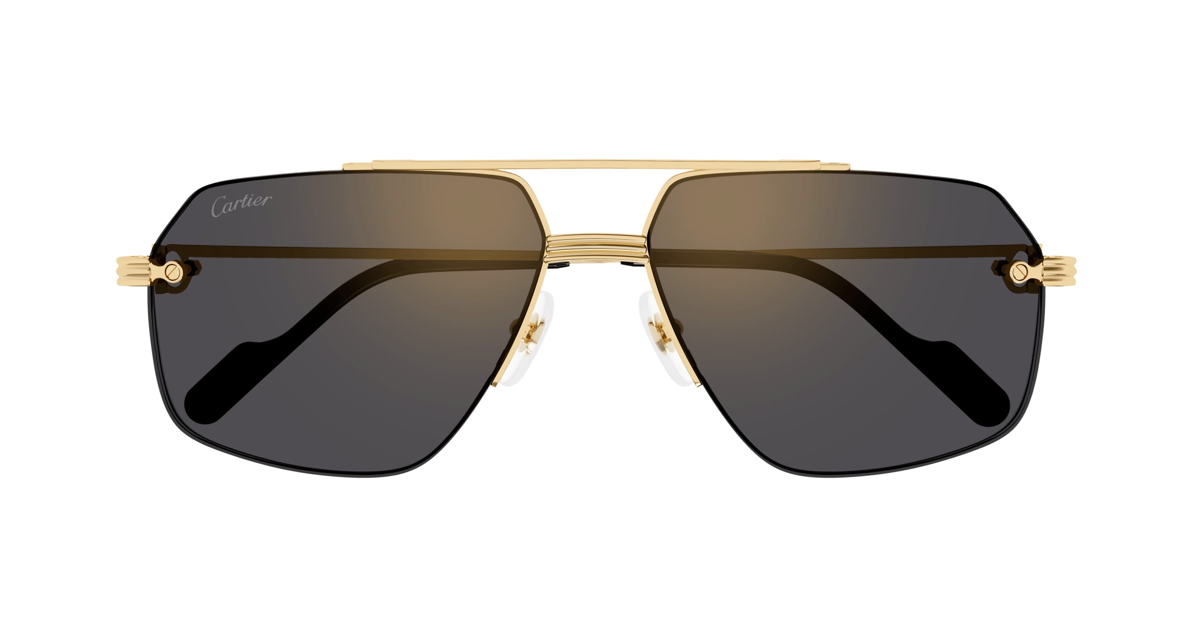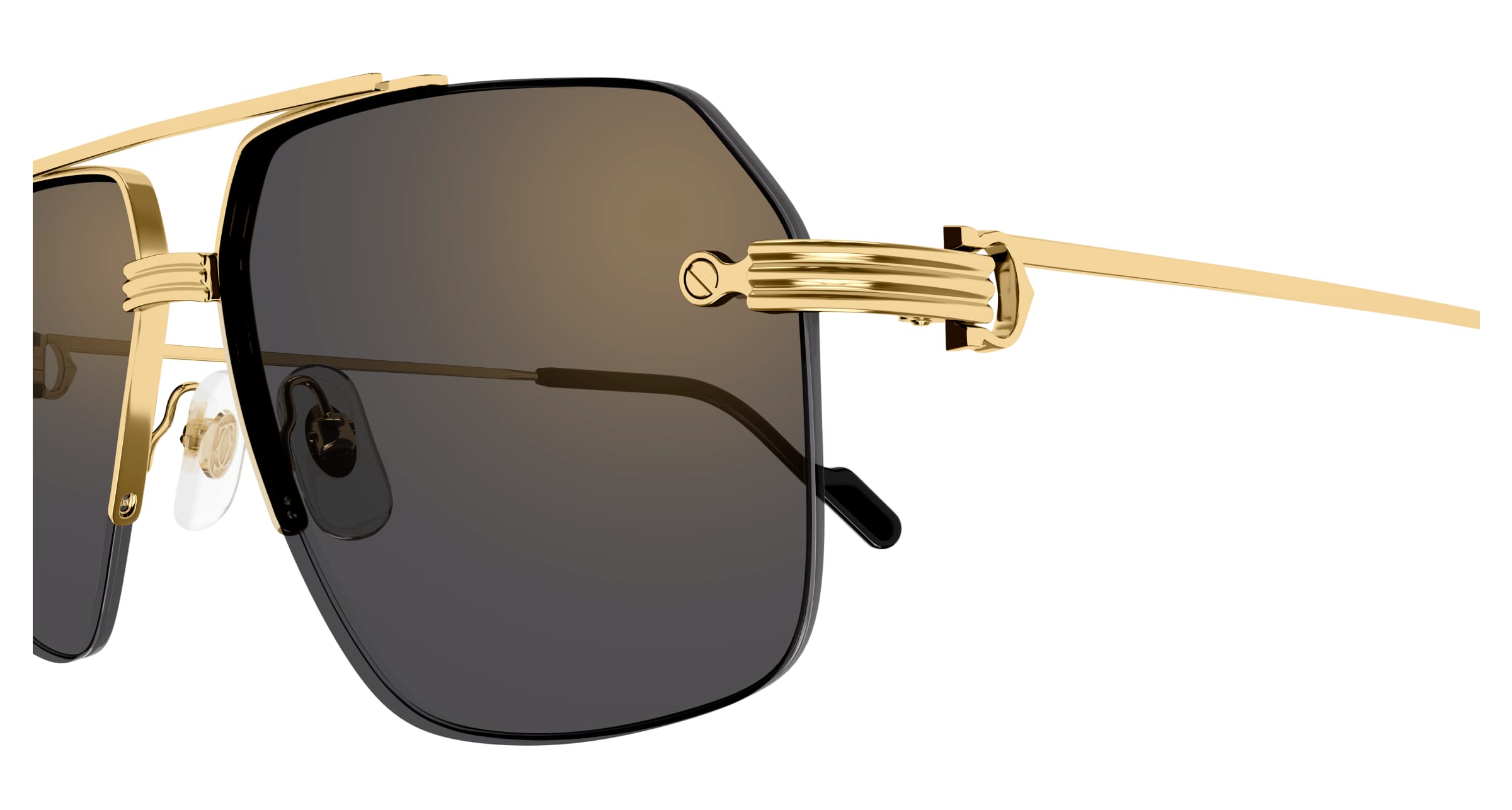 Neues randloses Gestell aus leichtem Metall mit Doppelsteg. Das Modell ist von dem ikonischen Vintage-Modell inspiriert, das ein modernes und zeitgenössisches Erscheinungsbild erhalten hat. Die maskuline, moderne Pilotenform ist mit dem C Décor und dem Godron-Detail versehen, die beide als ästhetisches und funktionales Element des Scharniers dienen. Die Bügelenden aus Acetat sind mit einer Plakette mit dem Cartier Double C-Logo versehen, welches von Vintage-Modellen inspiriert ist. Abgerundet wird das Modell durch ein kostbares Finish aus Gold (1 Modell mit zweifach galvanischer Beschichtung) und dreifach verlaufende Gläser (1 Modell).