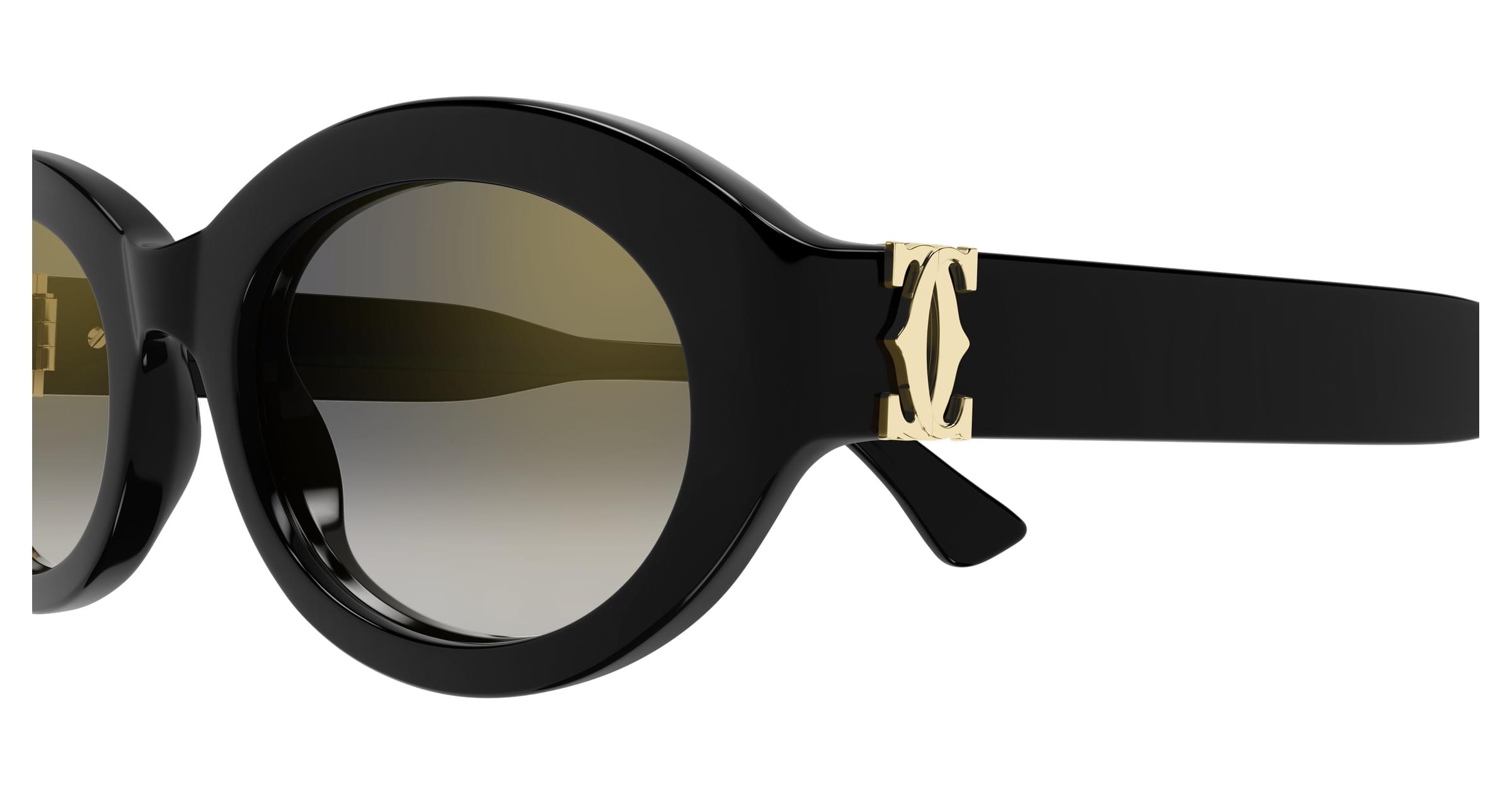 Leichtes, alltagstaugliches Acetatgestell mit Double C Detail am Scharnier. Die feminine Mandelform ist mit dem ikonischen Double C Detail verziert, das als ästhetische und funktionale Komponente des Scharniers dient. Kostbares Gold-Finish und eingraviertes Cartier-Logo auf den Bügelenden.