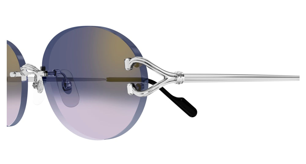 Décor C Classique de Cartier Sonnenbrille aus Metall, nicht eingefasst, glattes Silber-Finish, ovale Form, Gläser mit grauem Verlauf und goldenem Spiegeleffekt. Maße: Gläser 55 mm, Steg 18 mm, Bügel 140 mm.