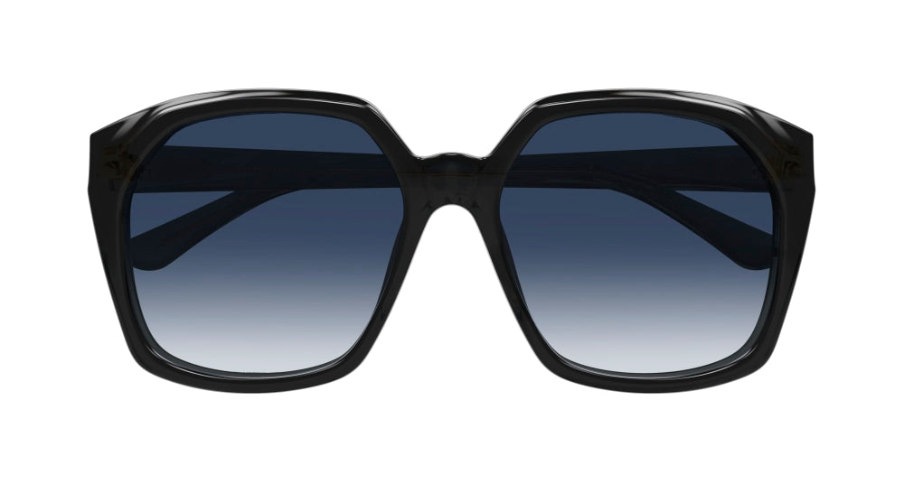 Eine eckige Retro-Form mit einzigartigen abgeschrägten Rändern und Facetten an der Vorderseite. Chloé-Logo aus Metall auf beiden Bügeln.