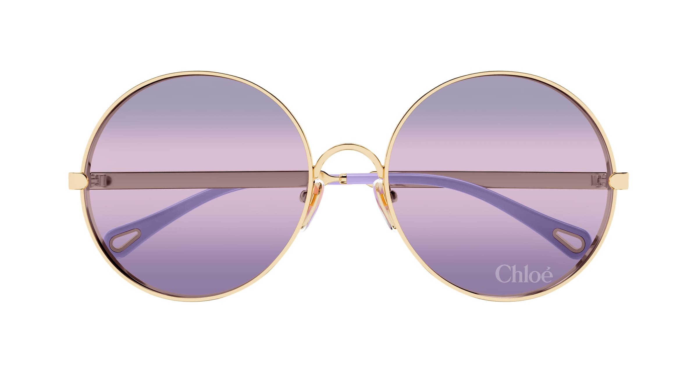 Oversize-Modell im Stil der 70er. Dreifach verlaufende Gläser mit dem eingelaserten Chloé-Logo auf dem linken Glas. Rundliche Form mit dickem Rand. Farbige Bügelenden, die die Gläserfarbe aufgreifen.