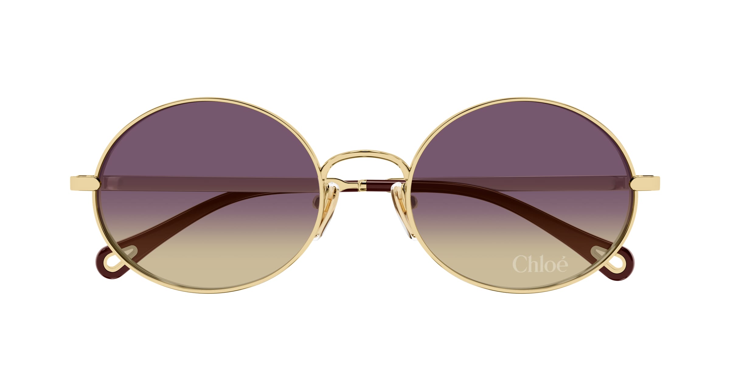 Kleine, ovale Form, aus Metall gefertigt. Zweifach verlaufende Gläser mit dem eingelaserten Chloé-Logo auf dem linken Glas. Die massive Konstruktion und die Ränder erhöhen die Wahrnehmung des Modells.