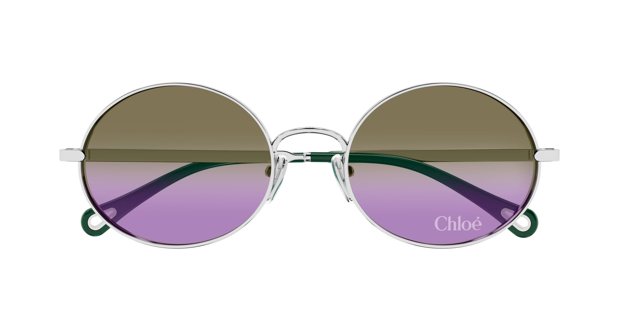 Kleine, ovale Form, aus Metall gefertigt. Zweifach verlaufende Gläser mit dem eingelaserten Chloé-Logo auf dem linken Glas. Die massive Konstruktion und die Ränder erhöhen die Wahrnehmung des Modells.