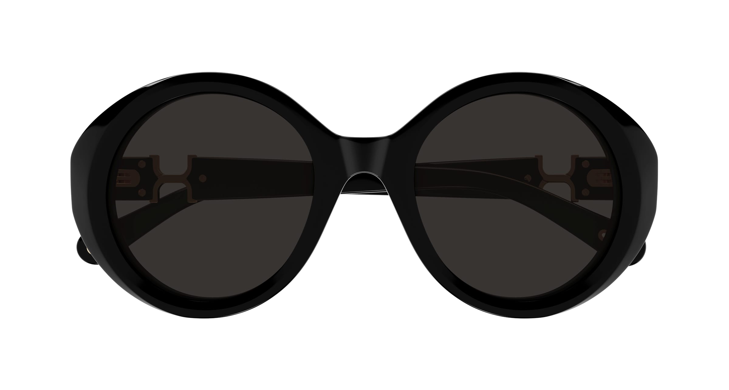 Rundliche Form aus Acetat. Das Marcie-Element in der Mitte der Bügel erzeugt ein Spiel der Bewegung zwischen vollen und leeren Formen.