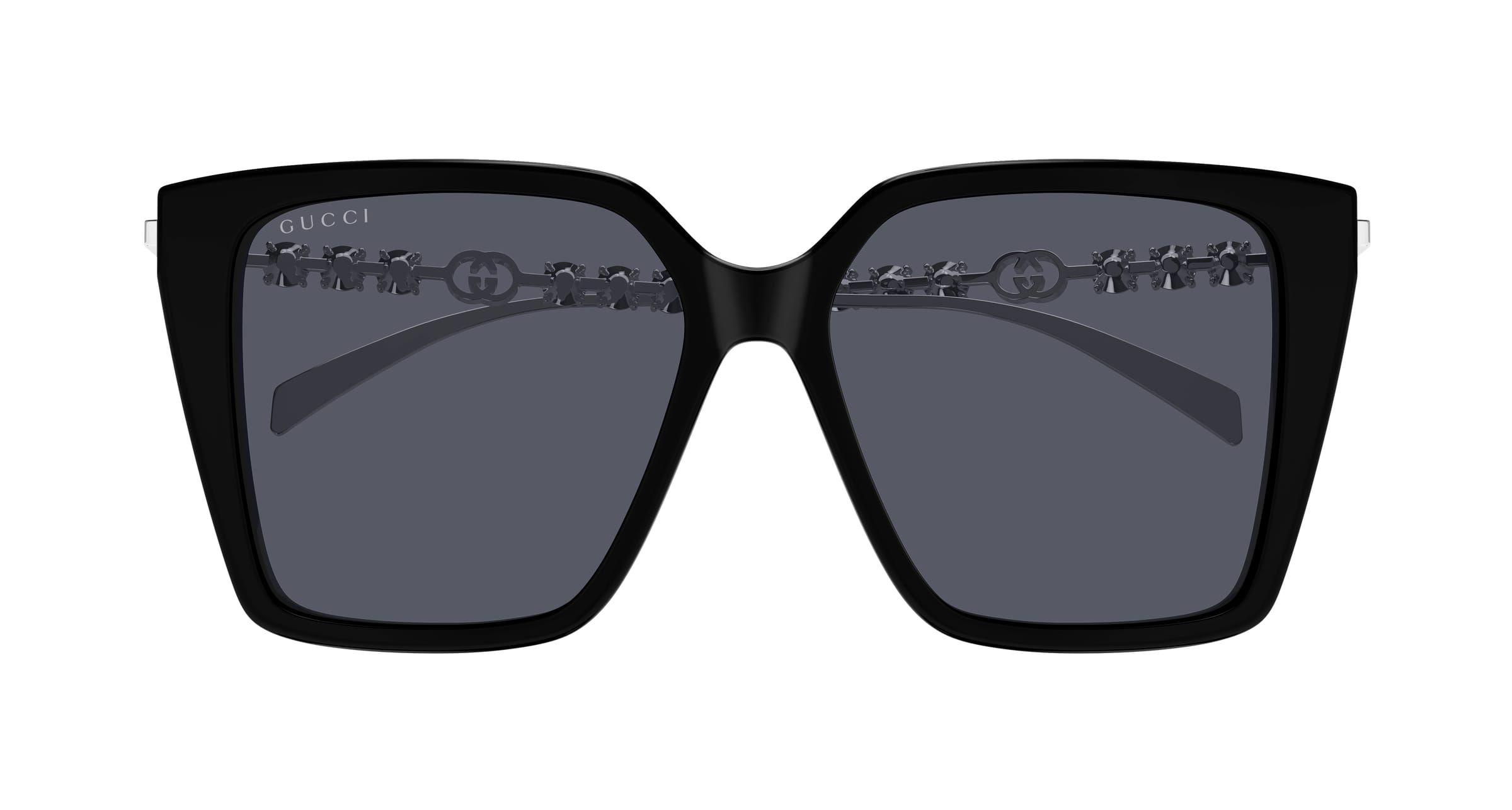 Schicke und feminine Kombi-Bauweise, verziert mit 6 Perlen oder Strassdetails auf jedem Bügel und kombiniert mit dem Interlocking G-Logo. Oversize-Schmetterlingsform. Elegante Farben mit Galvanisierung in Gold und Silber, mit Bügeln je nach Artikelnummer entweder mit Perlen- oder Strassbesatz.