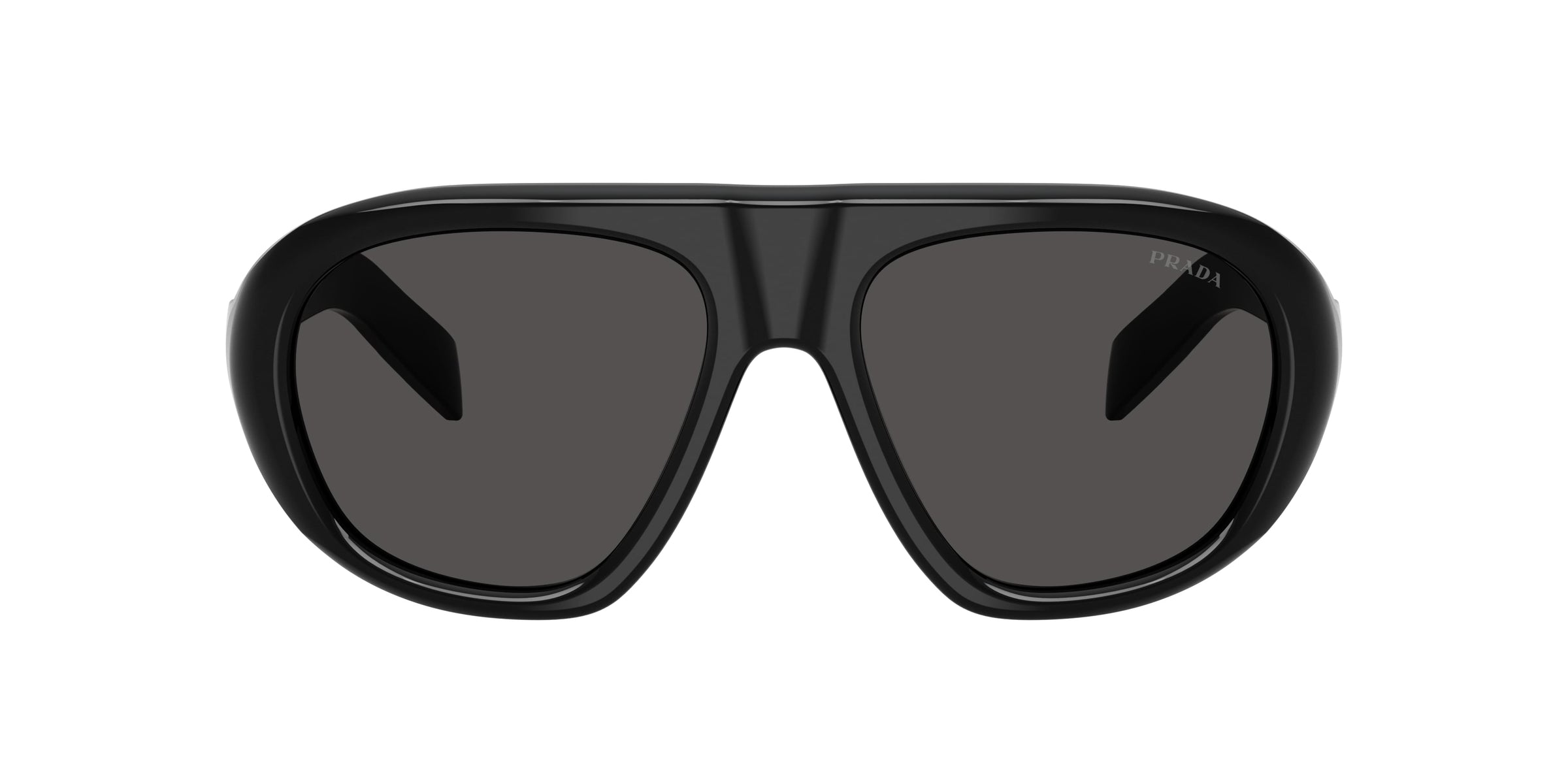 Die Sonnenbrille Prada C05S 16KO8Z 57 präsentiert sich in markanter geometrischer Form. Die glänzende Fassung in Schwarz besteht aus Acetat, mit schwarzen Bügeln (135 mm). Rahmentyp — Vollrand. Passform — mit hohem Steg, breit.