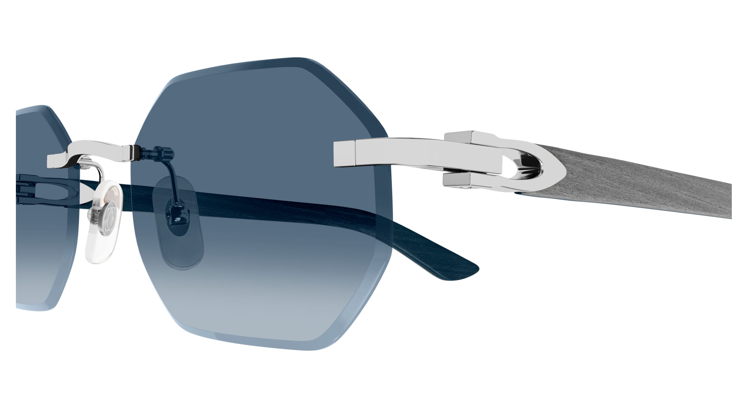 Die modernen und edlen Bügel aus Holz oder Horn sind mit dem ikonischen Décor C-Detail als funktionales und ästhetisches Element des Scharniers versehen. Die schmale, mehreckige Form der Verlaufsgläser in einem randlosen Gestell verleiht dem Model einen modernen und zeitgemäßen Look. Die Cartier-Logoplakette auf den Bügelenden ergänzt das Modell mit der eleganten Signatur der Maison. Ein edles Finish in Gold oder Platin runden das Modell ab.