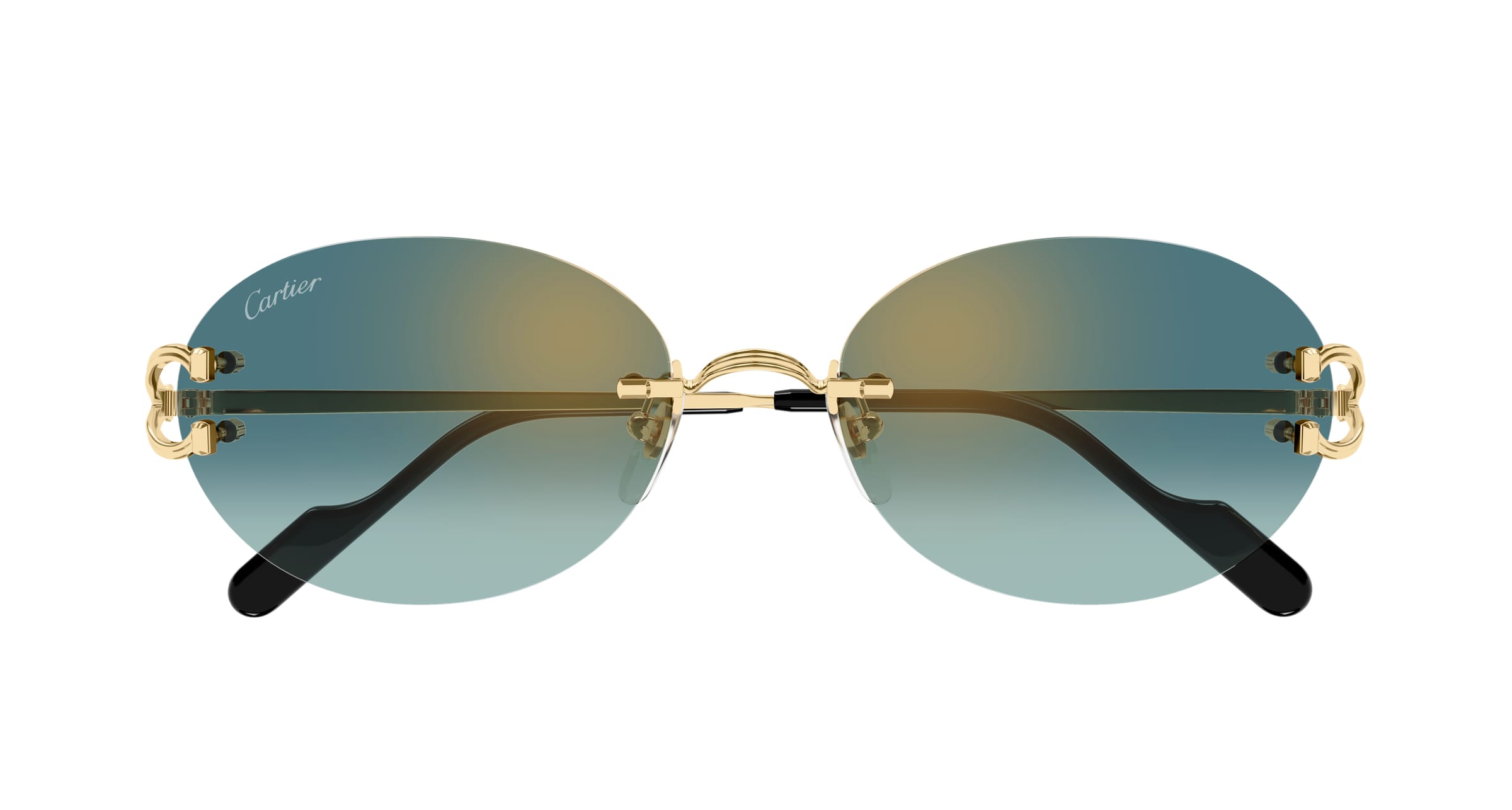 Décor C Classique de Cartier Sonnenbrille aus Metall, nicht eingefasst, glattes Gold-Finish, ovale Form, grün verlaufende Gläser.