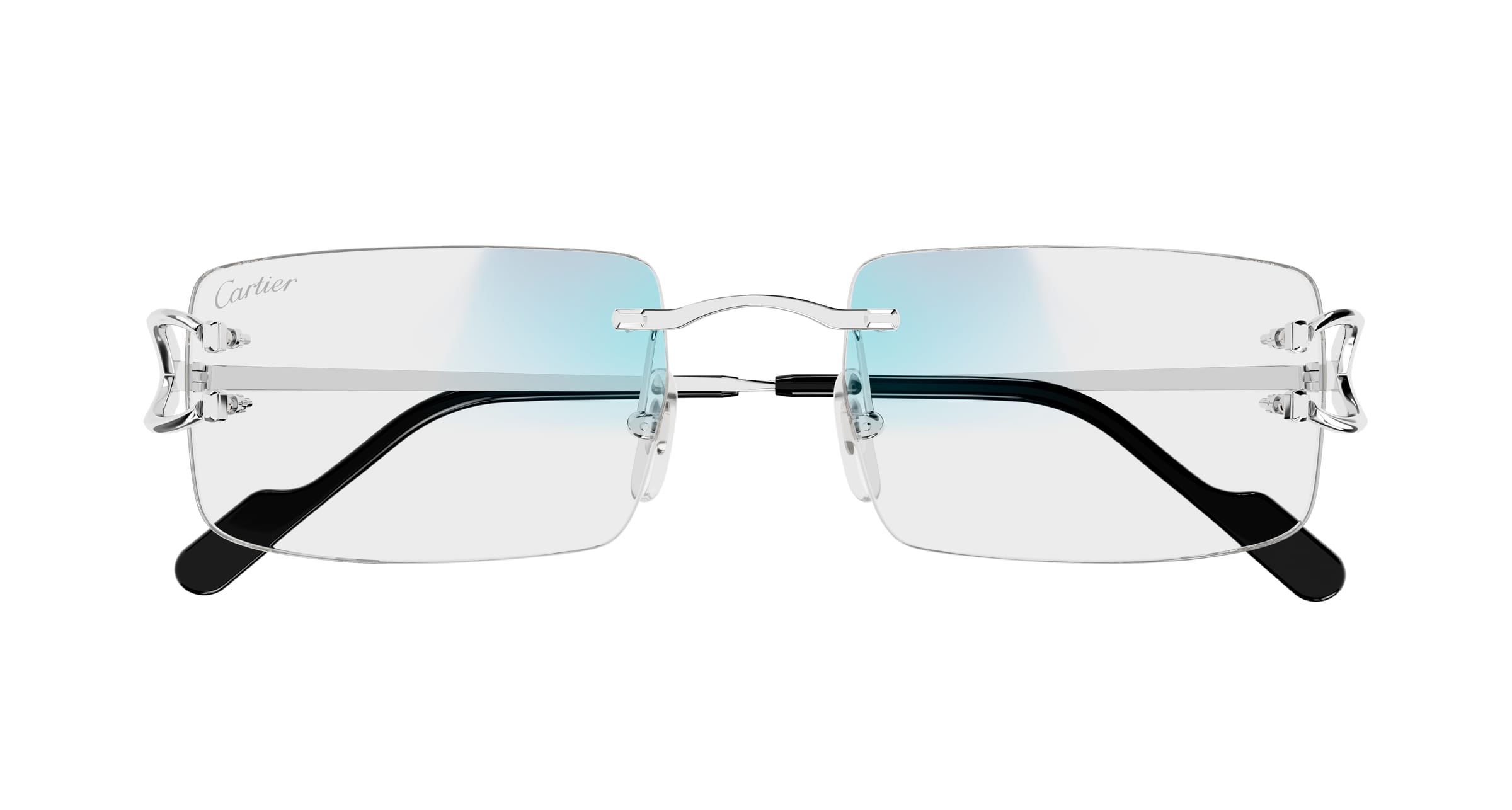 Randlose Konstruktion, bei der das ikonische C Décor Detail als funktionales und ästhetisches Detail des Metallscharniers dient. Photochrome Blue and Beyond Gläser. Kostbares Platin-Finish und Bügelenden aus Acetat mit Cartier Logoschildchen für garantierten Tragekomfort.