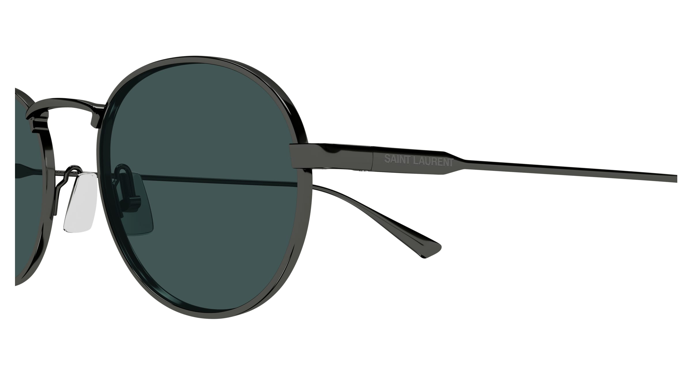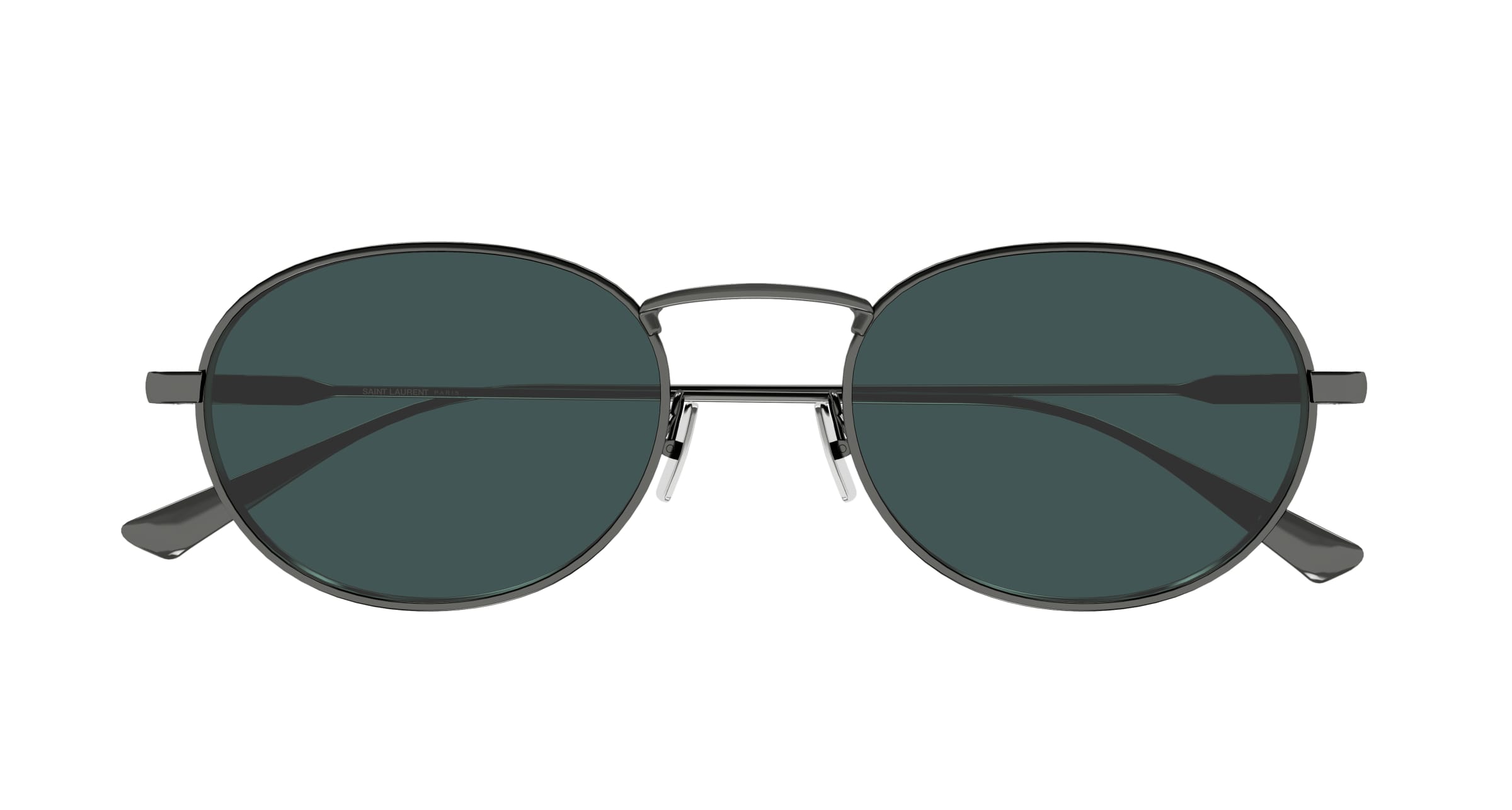 Metallmodell mit ovaler Form und einem einzigen hohen Steg und dünnen Metallkonstruktionen, inspiriert vom Look der 90er-Jahre. Von Anthony Vaccarello für das Damen-Lookbook FS25 gewollt.